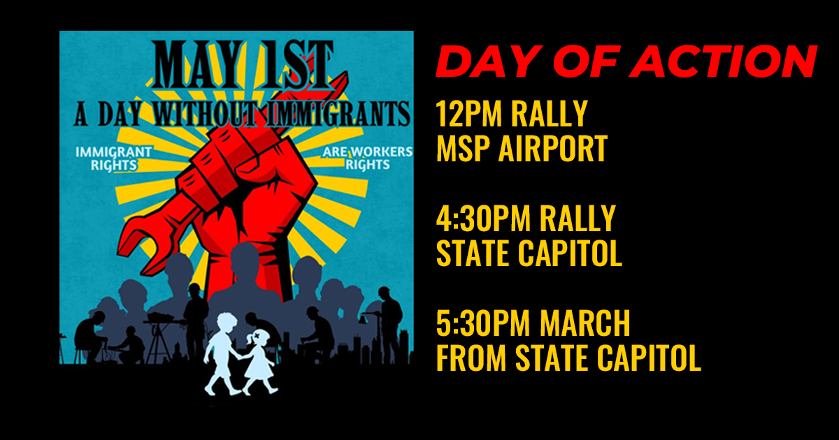 This is the next really big event: rally for immigrant and workers rights! Initiated by MIRAC, MN Workers United, MN Immigrant Movement, Asamblea de Derechos Civiles, Kalpulli Ketzal Coaltlique, MN8, CAIR-MN, MFT, Indigenous Protector Movement, EPNI.